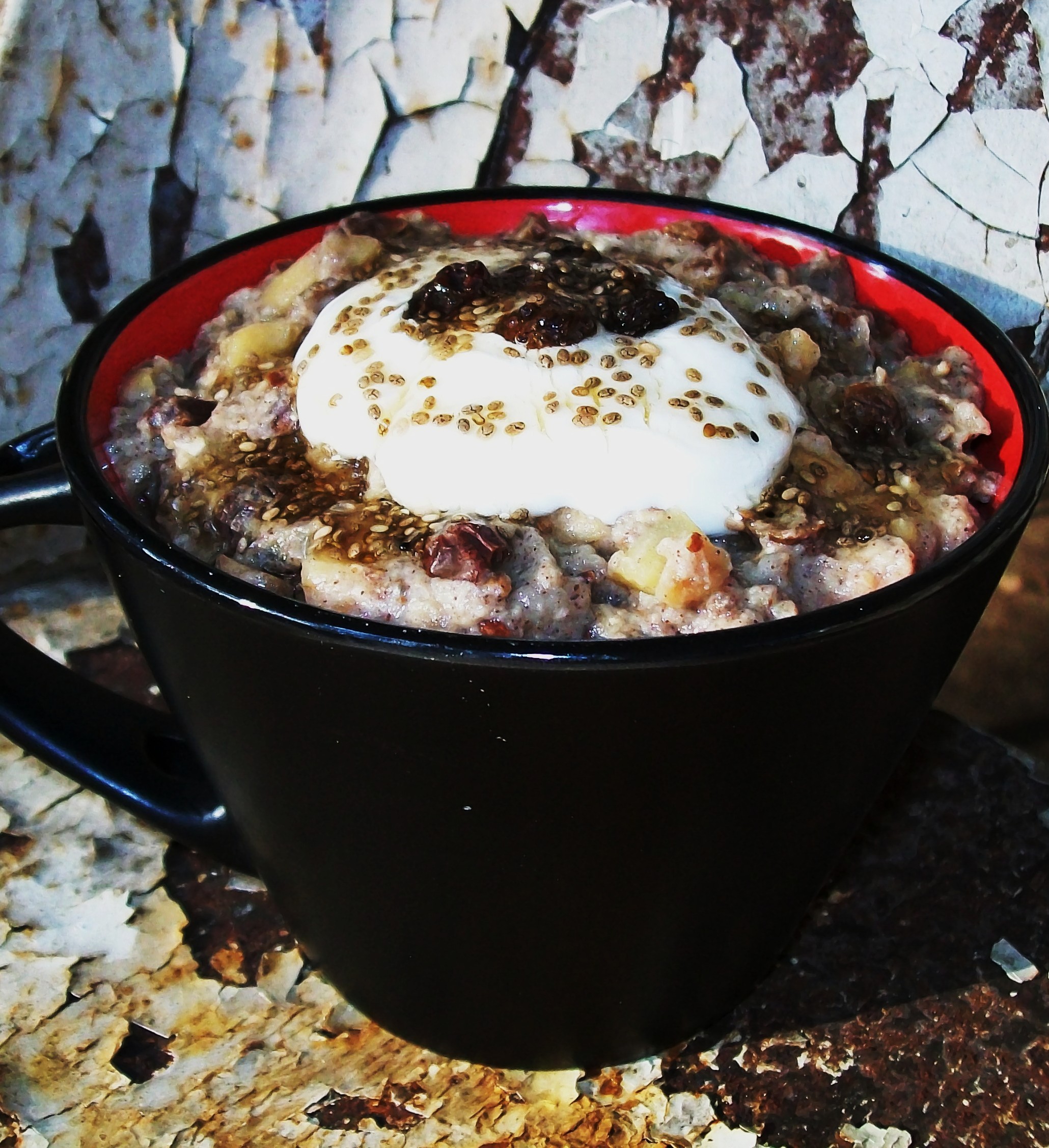 2/ Add the oats, flax, chia, cinnamon, raisins, apple, and Splenda. Stir well to combine and remove any lumps/clumps. This step can be done the night before and kept in the refrigerator. I like to keep the tea bag in it when I do this for extra flavor. Start with the next step in the morning.