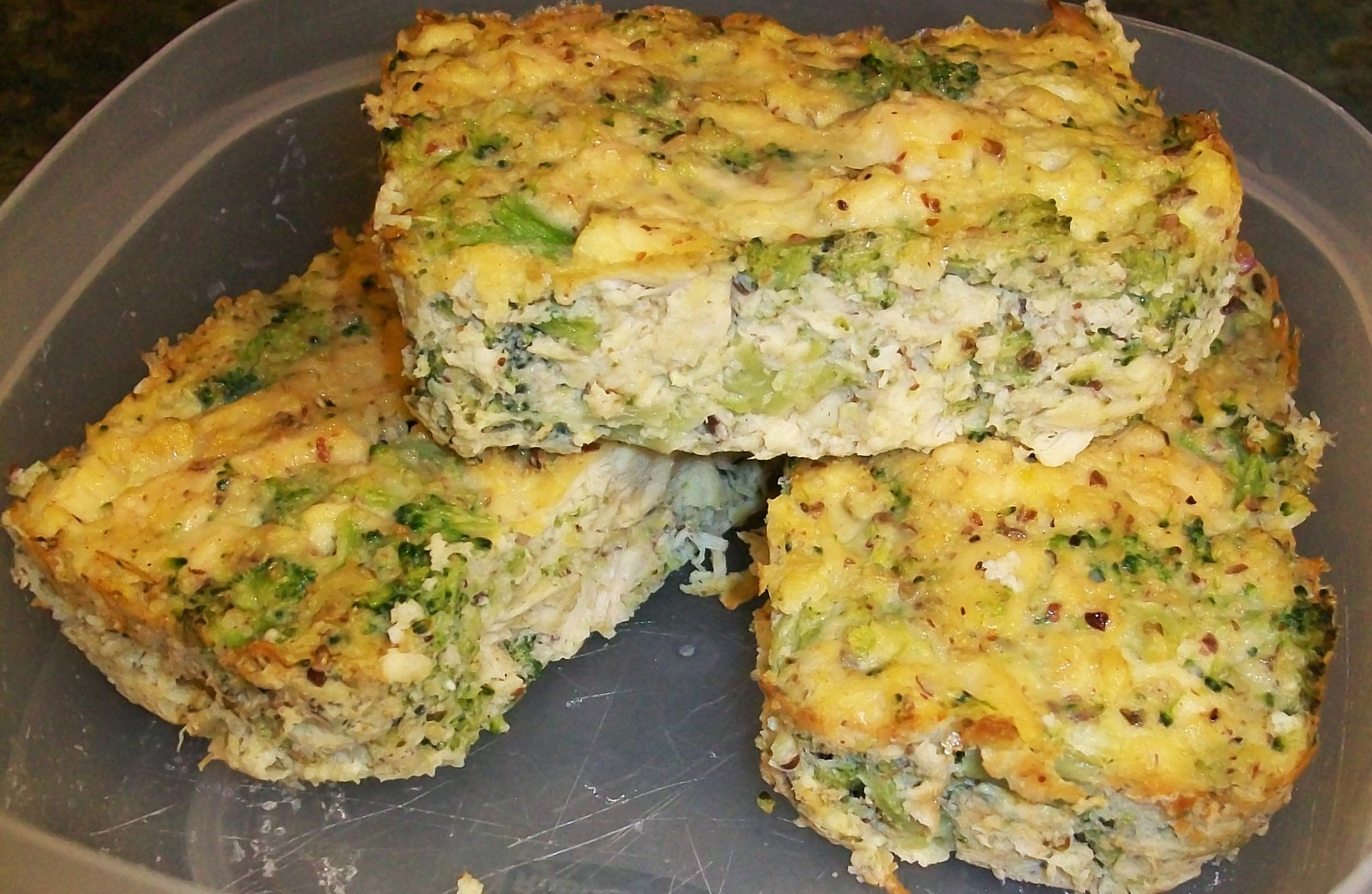 Chicken and Broccoli Meatloaf (recipe idea here) I doubled the recipe, used some flax meal and almond meal in place of part of the flour, and used chopped chicken breast instead of ground, because that’s what I had on hand. I think I under-seasoned them, but they were good, and even hubby liked them. They would be great with some healthy cheese sauce!