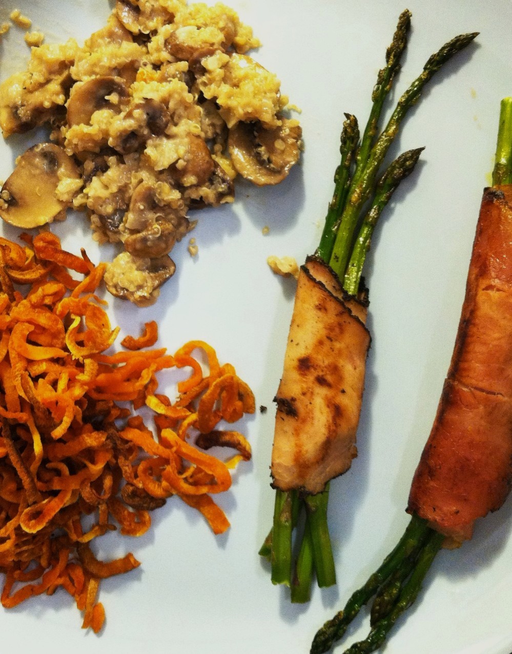 Asparagus and goat cheese wrapped with Boars Head Deli meat (idea source), baked sweet potato curly fries, and mushroom quinoa (will post the recipe at some point).