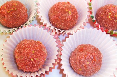 7/ Place the processed goji berries, lucuma, and truvia in a shallow dish. You could also add food coloring here too, if you want a more pink tint. Just mix a few drops with the truvia first, then add that to the rest.