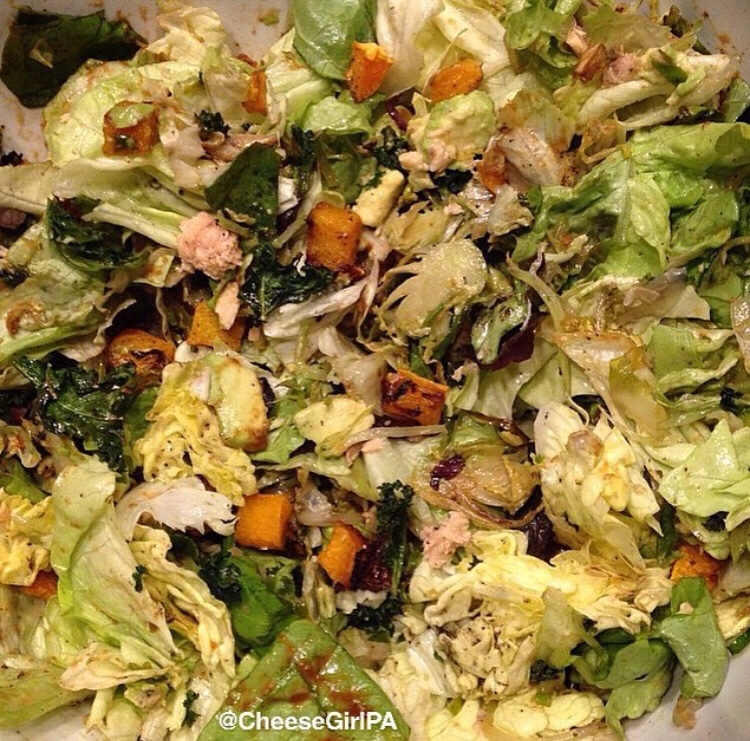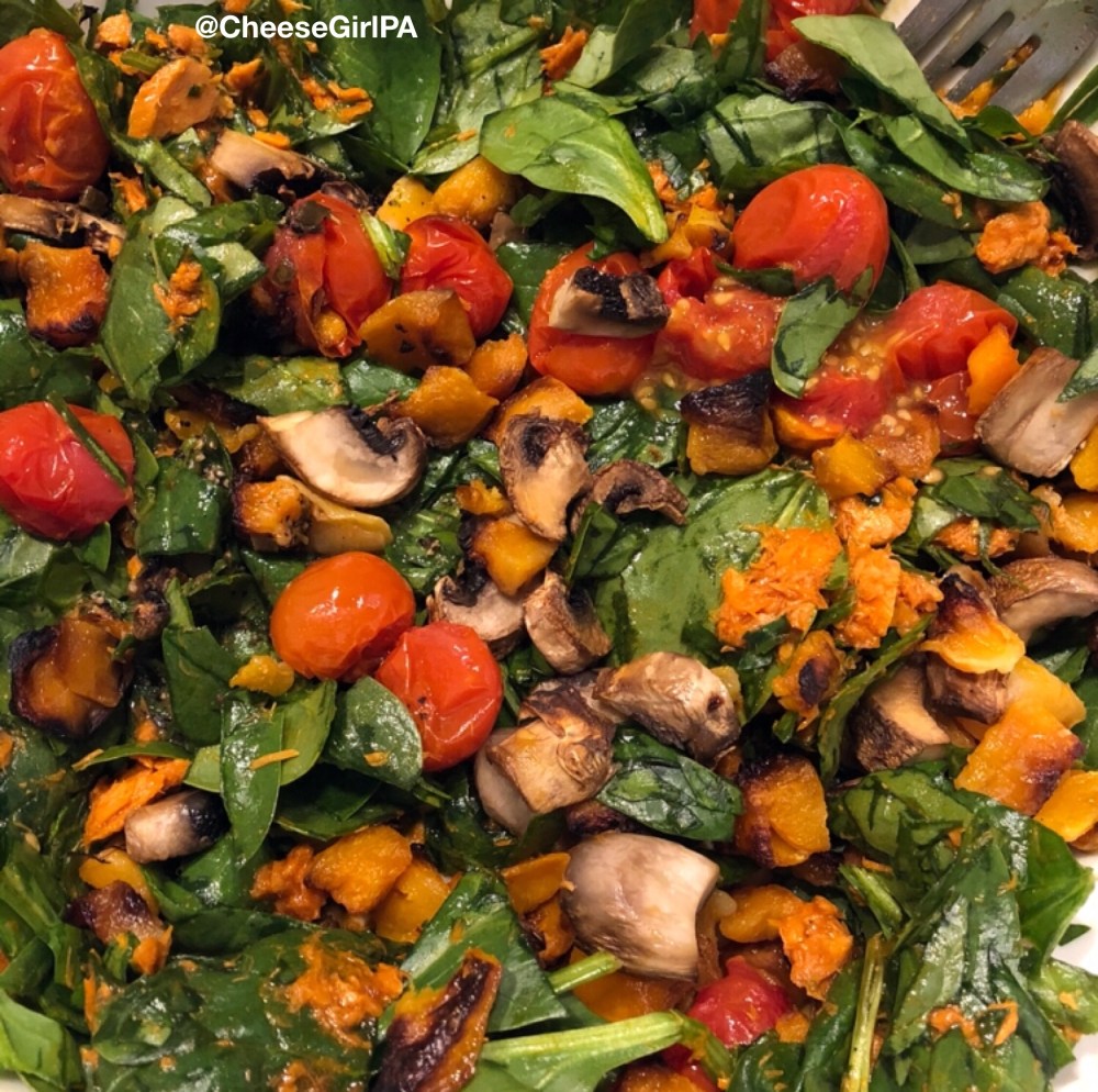Raw veggies add great texture, but I prefer to add at least some warm roasted vegetables to my salads. First, because cooked vegetables are easier to digest. Second, I also like the way that the warm vegetables wilt the salad greens slightly.