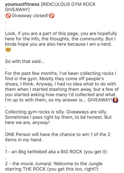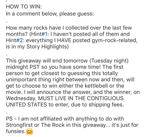 A few weeks back, I came across a new account on Instagram that resonated with me right away. While watching Jill Colman’s InstaStory, I saw an account featured and took a look. It was @youmustfitness (Sasha Brainerd) —–> make sure you check her out here and here. Besides mindset, fitness, delicious looking healthy eats, and Buffy quotes, I happened to notice one of her stories on “gym rocks.” She had been collecting all the little rocks she found at her gym and saving them. As you can imagine, it peaked my interest because of my own little collection of rocks. Fast forward a bit, and I saw that she decided to do a giveaway featuring her nifty little rocks, having her followers guess how many she had collected.