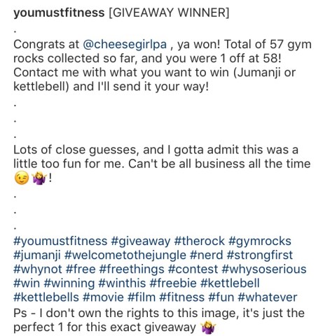 I had a choice between two “rock” themed prizes—a kettlebell or Jumanji (the one featuring the Rock). I chose the kettlebell!