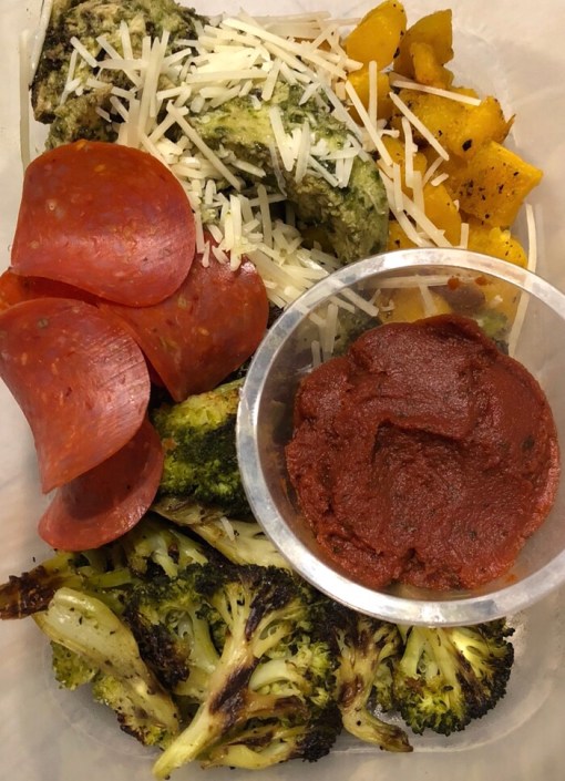 - I roasted my veggies and then divided them up between four Tupperware containers (see below) along with a serving of prepared pesto chicken (I used pre-made pesto chicken from Mellow Mushroom by ordering 4 carry out cups), turkey pepperonis, and Parmesan.