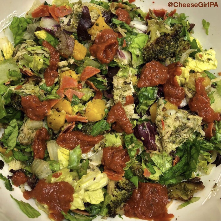 - When it was time to eat: I dumped the salad greens and pepperoni in a bowl and used a pizza cutter to chop them (I use an OXO Salad Chopper and Bowl at home but I keep a 99 cent pizza cutter and bowl at work for my chopped salads). I warmed the toppings (chicken and veggies, not the pepperoni) in the microwave for 1 minute. Then I added them into the bowl with the salad and choped again!