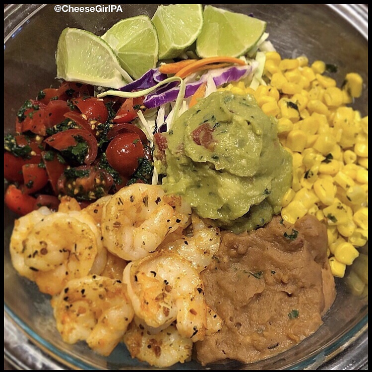 Hubby had fish tacos—and they were so good he went back for seconds! That’s saying a lot, as fish tacos are one of his absolute favorite meals. Our favorite local place for fish tacos closed and since then, nowhere else ever stacks up—trust me when I tell you, we have been on the hunt! Anyhow, I usually do then tacos too, but just eat the filling and not the wrap, but Surf N Turf had the option to make a salad bowl, which basically was a fish taco, sans taco shell/wrap! You got to choose toppings (I had lettuce, cabbage, refried beans, corn, salsa, guacamole, fresh cooked shrimp, cilantro, and lime. It was so fresh and flavorful, I knew I had to recreate it at home. I proud to say I was successful!