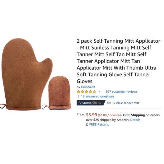 I was disappointed with the mitt that came with it as it tore up after about three uses. My finger poked a hole in several places along the seam. You do not want that to happen with this product, or you will end up with stained hands! See below the ones that I ordered to replace it and absolutely love (you can get them here). There’s no way my finger is going to poke through the hole on the seams of this one! Plus, you have a separate mitt for the face. As an added bonus they were actually cheaper than the original one and had free shipping. I purchased them on Amazon and the St. Tropez at Ulta, but you can get the St. Tropez on Amazon (here) as well. I just did not want to wait once I saw her post about it! 😂