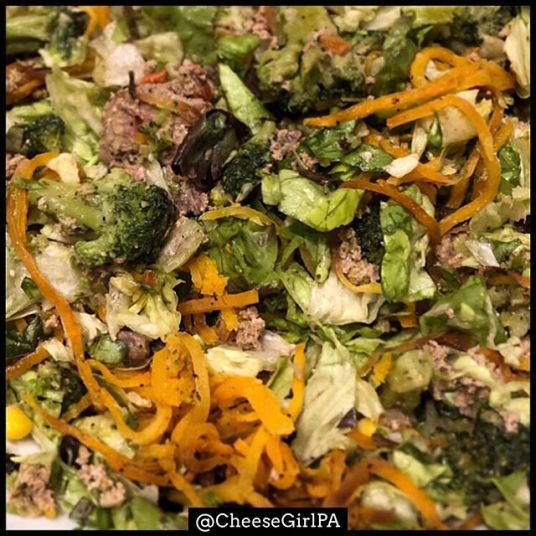 The #MacroMicroBowl (aka hot/cold salad) with roasted veggies and meat over a chopped salad is one of those meals for me. Some other ideas for meals that have the same basic recipe, but which can be totally transformed with some ingredient swaps: overnight oats/hot oatmeal, protein shakes/smoothies, salads, scrambles/omelets, stir-fries, soups, protein bars, protein pancakes/muffins/cookies/breads, etc.