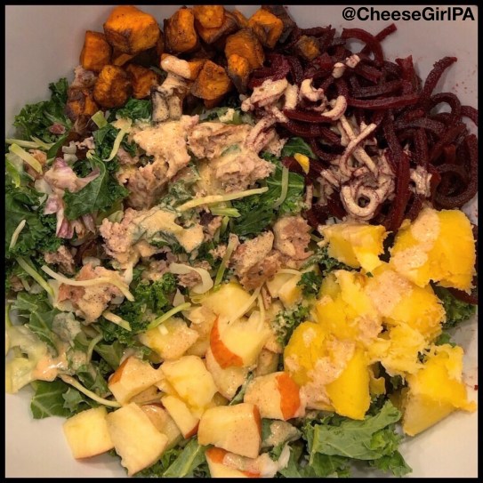 Kale, kale slaw mix, roasted acorn squash, air fried sweet potatoes, Green Giant spirilized beets, jazz apple, and a new-to-me brand of bacon flavored ground turkey I found at Publix. Made a almond/cashew butter vinaigrette since I didn’t have enough of either for the recipe and forgot to buy the tahini I planned to use🤦🏻♀️