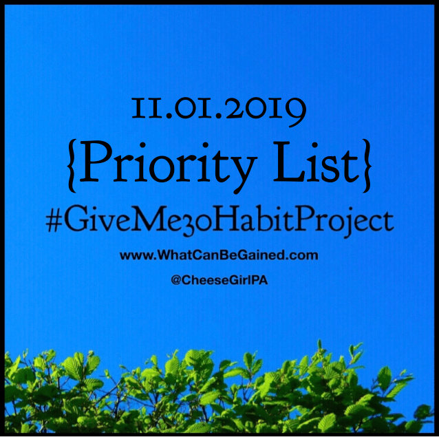 Note: For myself personally, my quiet time with the Lord is the thing that becomes that comes before all else. As I noted in the Habit Project post from August, writing in my gratitude journal, Bible study, devotional reading, and prayer time are essential for me to fill my cup before I start my day. That lays the foundation for my productivity from there. After it is accomplished, I can move onto my priority list.