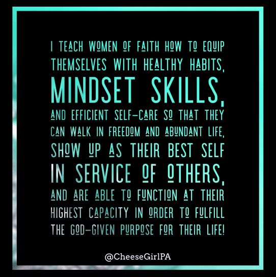My mission: I teach women of faith how to equip themselves with healthy habits, mindset skills, and efficient self-care so that they can walk in freedom and abundant life, show up as their best self in service of others, and are able to function at their highest capacity in order to fulfill the God-given purpose for their life!
