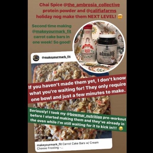 I made a few tweaks to the base bar recipe (see ingredients below). Again, check out @makeyourmark_fit’s page for full recipe and instructions!