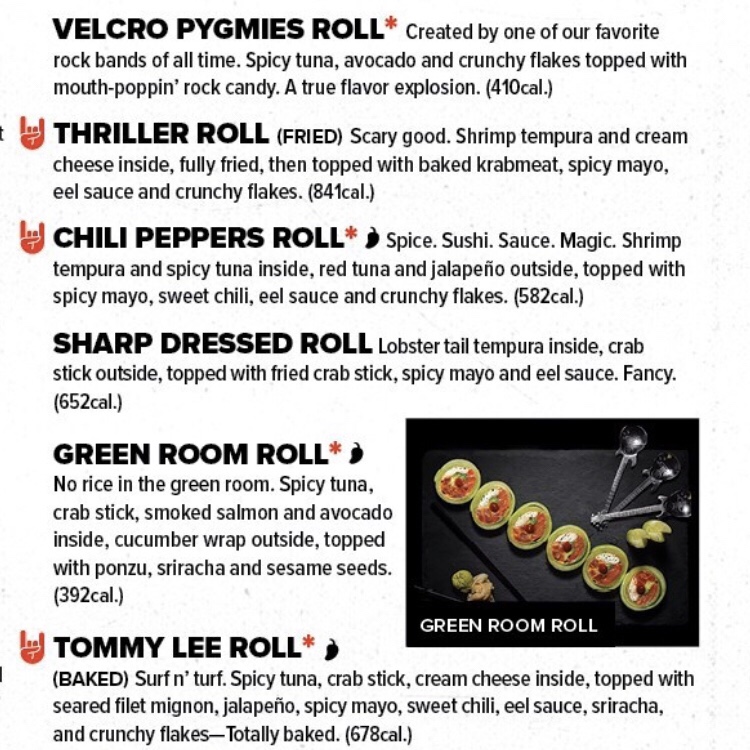 The green room roll (pictured on the menu) was less than 400 calories, and the seaweed salad and squid salad were both less than 200. They had some other delicious sounding salads and sashimi with great nutrition as well! See below for some menu screenshots! Find the full menu here (scroll past the pictures that load and it is 2 full pages).