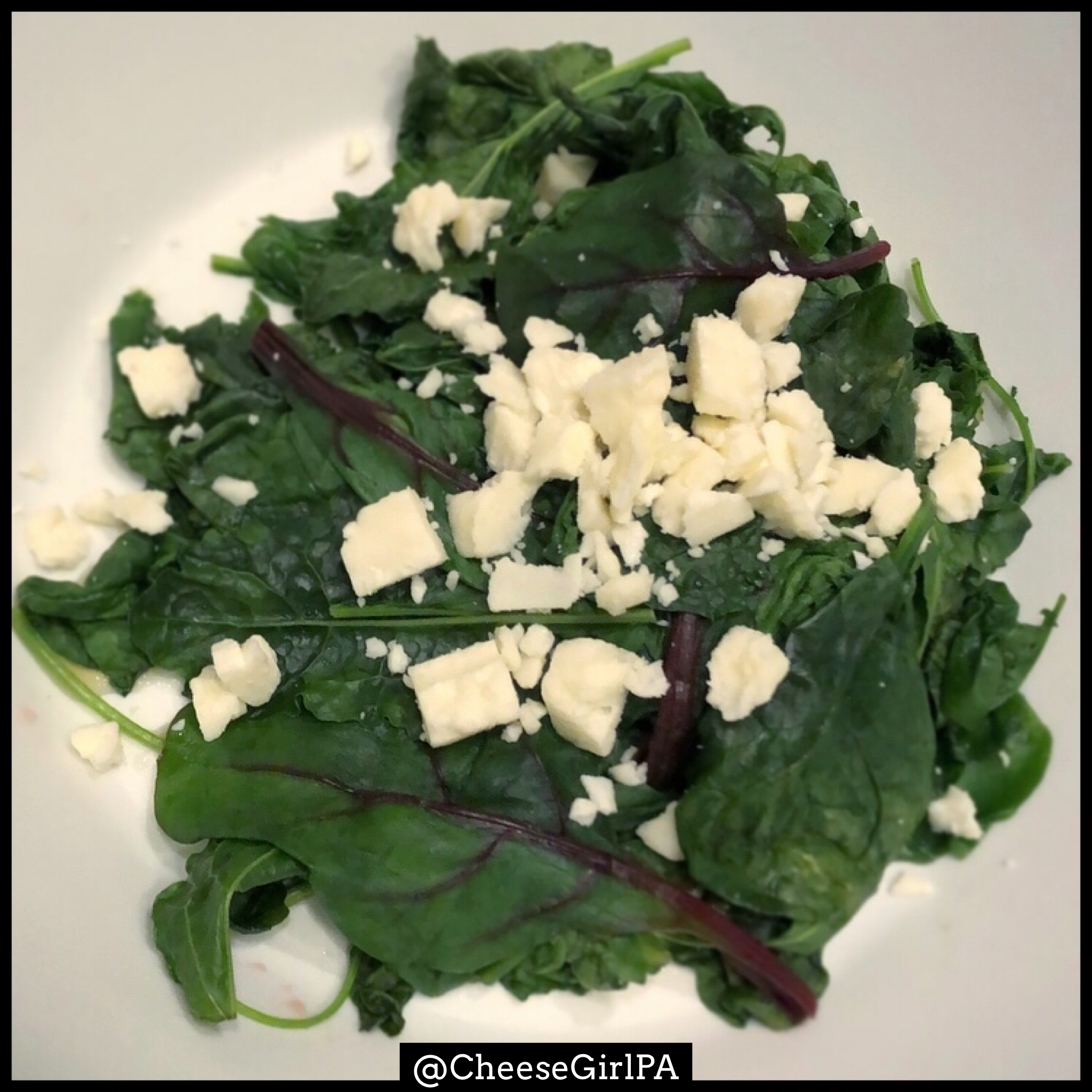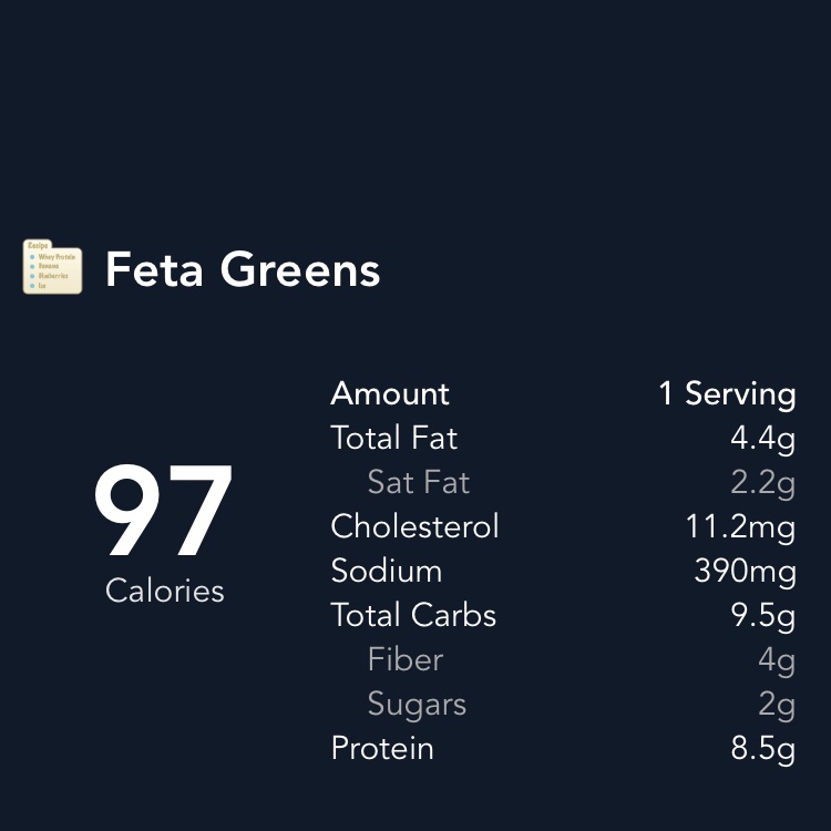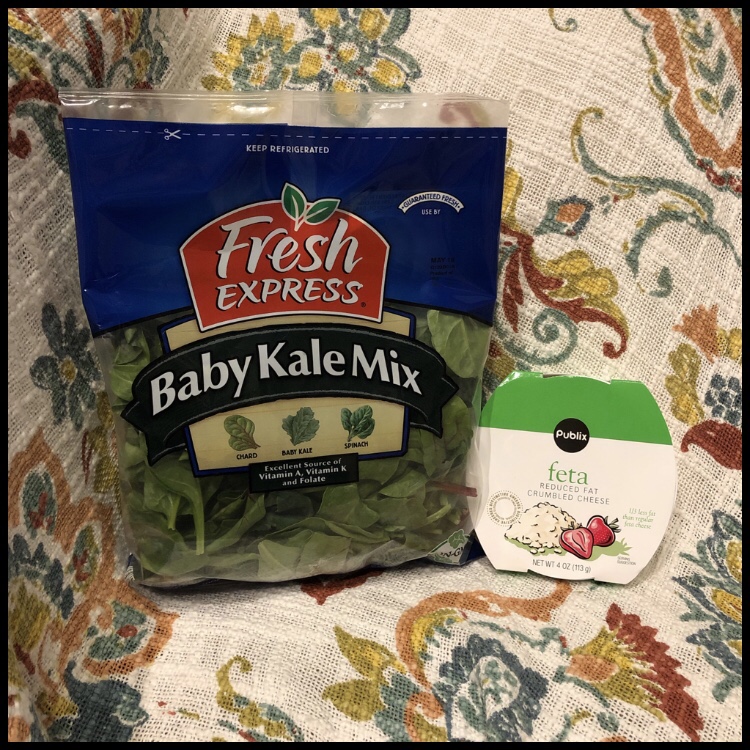 For one serving: Steam one bag of Fresh Express Salad baby greens mix in the microwave (I just poke holes in the bag with a fork) for 2 minutes. Place on a dish. Then top work 21g of reduced fat feta. The feta gets a bit meaty and it’s an amazing combination! Simply duplicate by the number needed if you are cooking for more than one person.