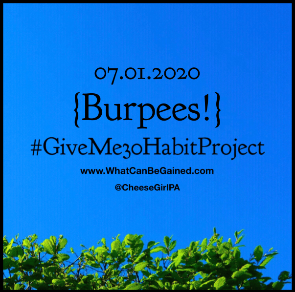 This month’s challenge is to do burpees, specifically 20 burpees every day for the full month. It does not matter when or how you do them, just as long as you do 20 over the course of the day. I started a few days before the month began and have been doing them in-between sets during my workouts. Major tip though is to figure out a way to remember them on your non-training days. I forgot to do them on my first rest day, so I will be starting my 30 days over again with you all today! For ideas on how to set up triggers to remember to do your burpees if you do them at a different time than your workout (and for a reminder in rest / non-workout days), see this post with a ideas.