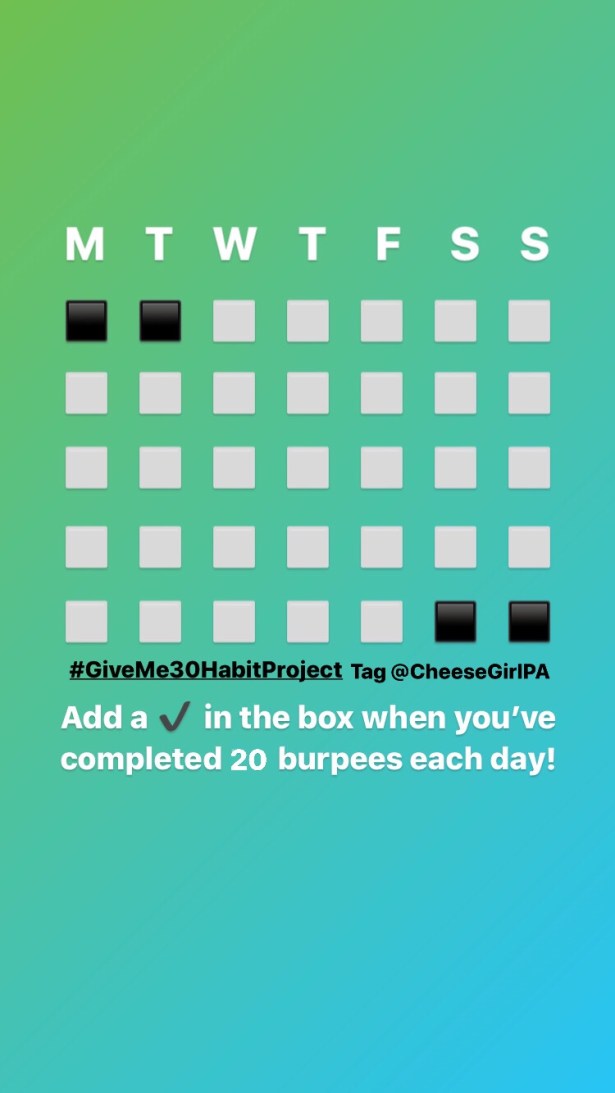 I got the idea from Katie Crokus who shared how she was doing 20 burpees a day for a full month on Instagram. She actually videoed herself doing them and posted every day and her stories for accountability! Make sure you give her a follow if you aren’t already. She shares some delicious recipes, tips on making healthy living a sustainable lifestyle, and other encouraging stuff as well!