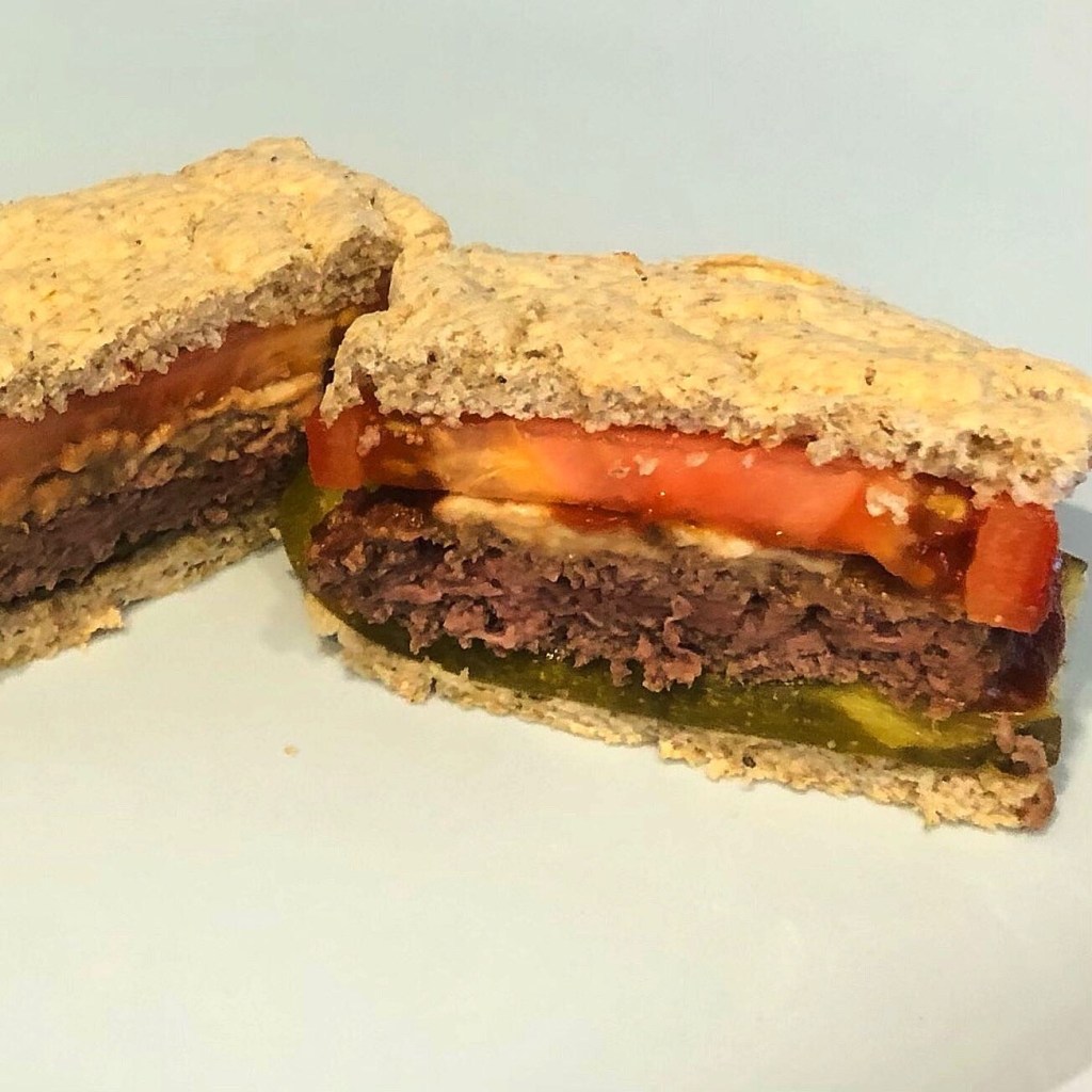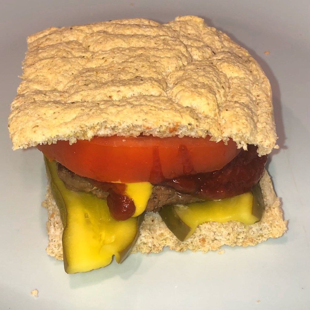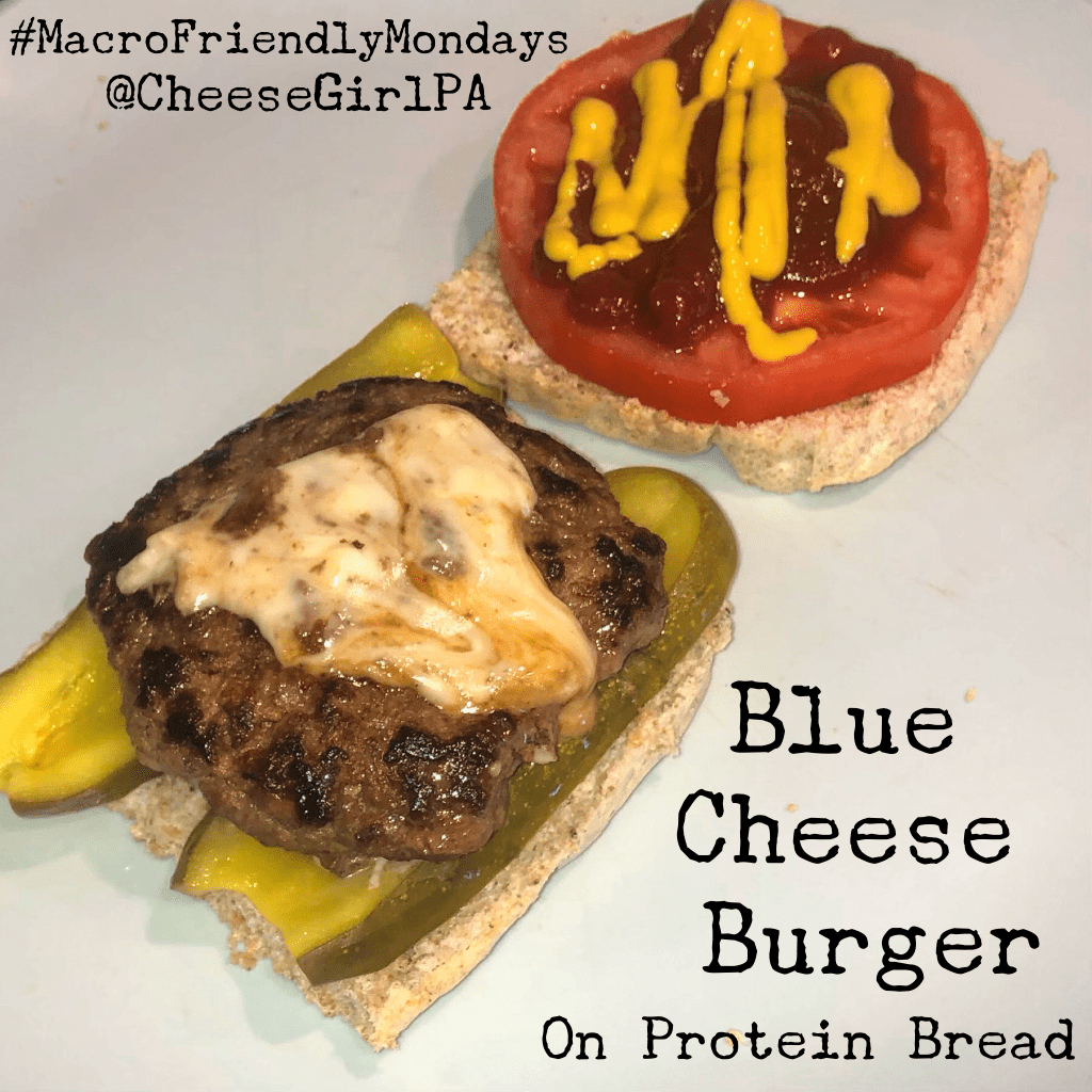 For the bread, I used one serving of my 3 ingredient macro-friendly bread (I left out the optional sweetener and added some Weber herb seasoning). You can use find the recipe for the 3 ingredient bread here. I for the burger, I used 4 oz 96% lean ground beef mixed with 1 tsp (~5g) Dales marinade cooked medium rare (or to preference). After you cook the burger, add 14g reduced fat blue cheese on top and let it melt (I recommend using 28g if your macros allow, but nutrition reflects 14g). Add toppings of choice (I used tomato, dill pickle slices, mustard, and Sir Kensington’s ketchup. See below for the nutrition which includes the burger, Dales, 14g cheese, and bread.