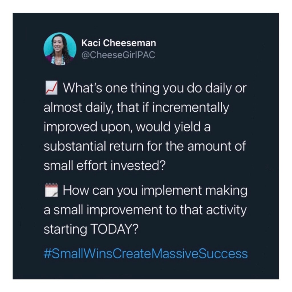 Do not underestimate the power of making incremental changes. As Dr. Kashey would say, #SweatTheSmallStuff! Little improvements might not be sexy, but they are sustainable… and isn’t that what we are all really after in the end?