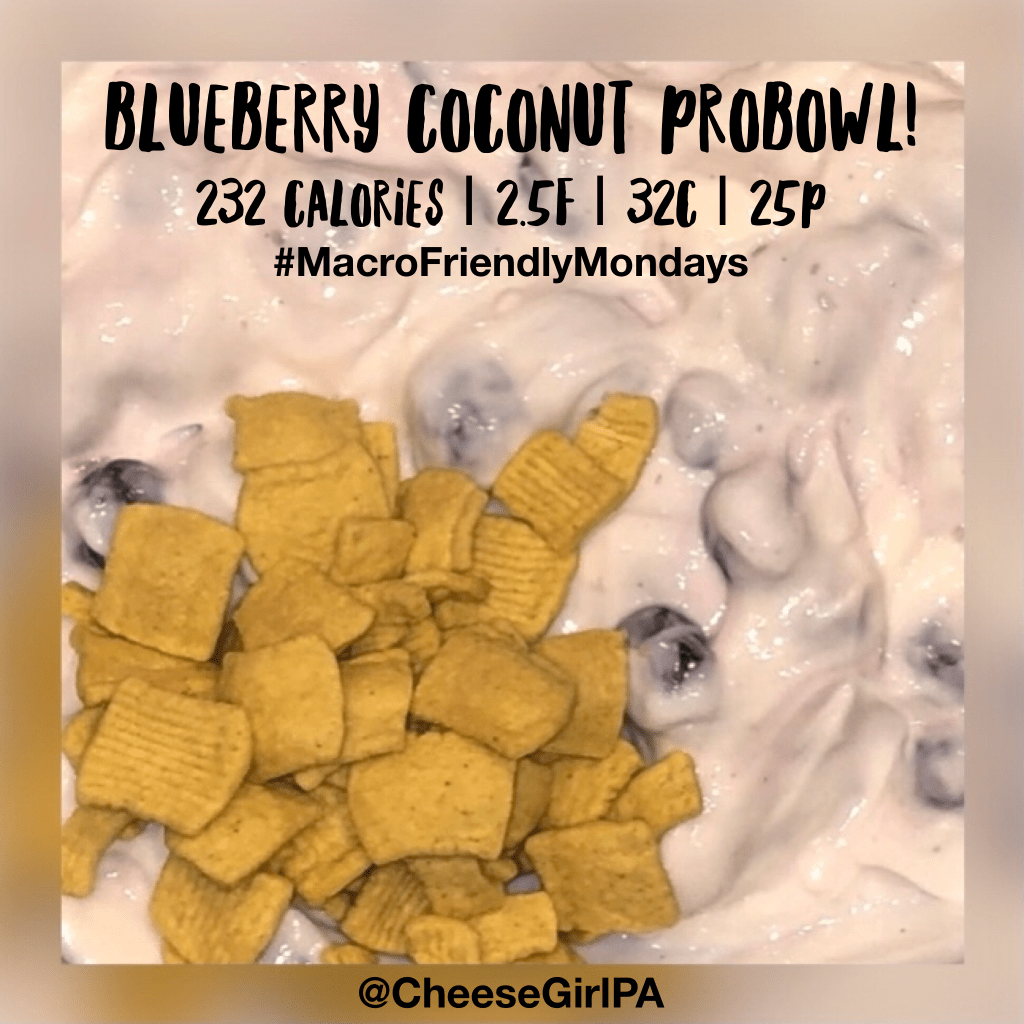 #MacroFriendlyMondays post is a seriously simple concoction that legit blew my mind! Do not brush this one off! I’m telling you it’s been on repEAT for breakfast since I threw it together on a whim. I don’t really know what to call it, so #ProBowl it is! It actually remind me of a healthy grape salad, only with blueberries. You can tweak ratios to suit macros. Just make sure you use frozen blueberries, not fresh and be sure the blueberries are still half frozen! That’s where the magic is at!
